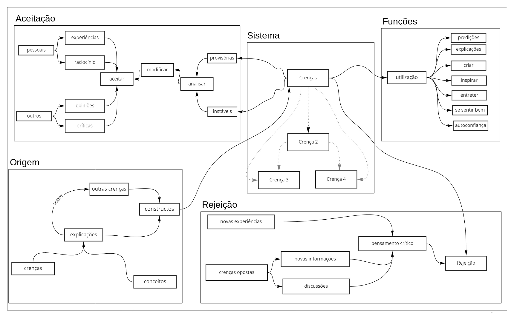 O diagrama nos mostra que as crenças são construções mentais cuja origem pode ser remontada não unicamente às outras crenças que acolhemos, assim como às explicações que elaboramos sobre as nossas crenças. As explicações se fundamentam basicamente em crenças ainda mais primitivas e se sustentam nos conceitos que dispomos para refletir sobre o mundo e sobre as nossas próprias crenças. Assinalar que utilizamos as abstrações conceituais para entender o mundo não significa, contudo, afirmar que a assimilação de uma crença somente é efetivada após um longo processo de crítica e reflexão.