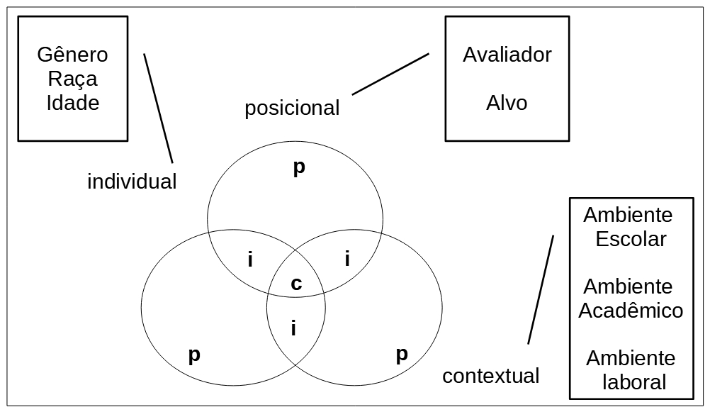 O modelo aqui alinhavado, inicialmente elaborado para explicar as relações entre a cognição e os estudos culturais (Pereira, & Araújo, 2013) e expandido para permitir o estudo dos estereótipos, adota como critério decisivo para estabelecer a taxionomia a diferenciação entre elementos encontrados em três níveis analíticos: as características inerentes aos indivíduos, o contexto em que os indivíduos se inserem e, por fim, as posições hierárquicas de indivíduos que se relacionam nos contextos por eles ocupados. Os elementos constitutivos do modelo e as relações entre os elementos podem ser identificados no diagrama da figura 89; nele podemos diferenciar os estudos segundo o critério da centralidade, sendo possível caracterizar alguns estudos como periféricos (p), outros como intermediários (i) e um tipo específico de estudo caracterizado como central (c).