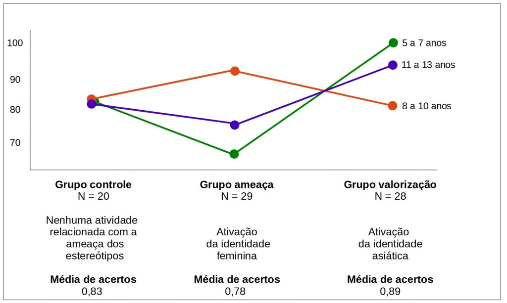 Conforme observamos no gráfico apresentado na figura 90, o efeito da ameaça foi perceptível nas crianças de cinco a sete anos, assim como nas de onze a treze anos. O que torna o resultado interessante para a nossa discussão é que tanto os efeitos da ameaça dos estereótipos quanto a valorização da identidade asiática produziram resultados contrários ao esperado no grupo de crianças de oito a dez anos, o que evidenciou uma interação complexa entre as características individuais dos participantes do estudo e a situação experimental criada pelo pesquisador.
