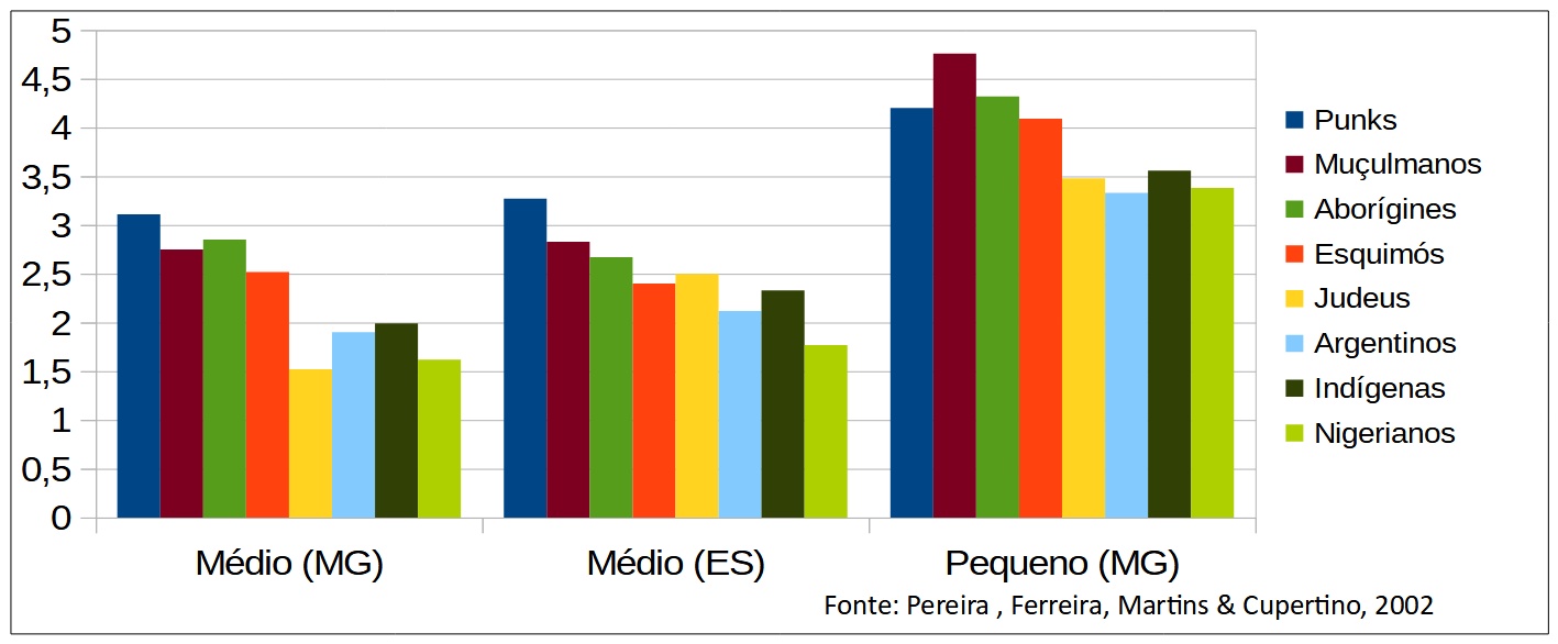 O contexto também pode se referir aos fatores geográficos, climáticos ou históricos. Conduzimos um estudo com a finalidade de avaliar a influência do tamanho da cidade de residência do participante na imposição de distância social em relação a algumas categorias sociais (Pereira, Ferreira, Martins & Cupertino, 2002); nele, comparamos as respostas de participantes residentes em três cidades de dois estados brasileiros, sendo duas delas de porte médio e uma de pequeno porte. A hipótese subjacente ao estudo era a de que os participantes da cidade de pequeno porte deveriam impor um maior grau de distância social do que os residentes nas cidades de maior porte.