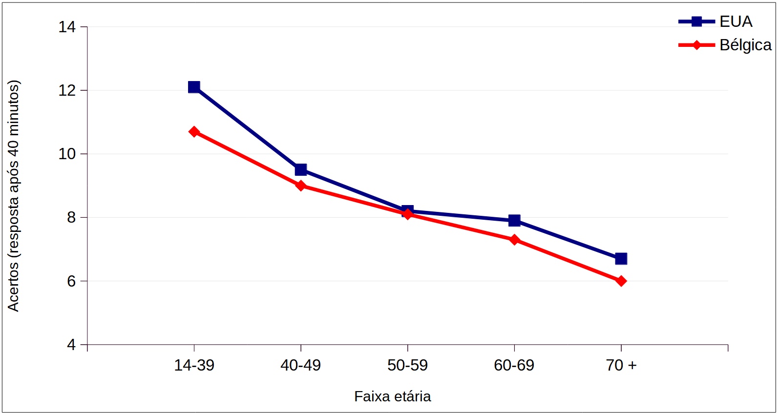 A redução do desempenho na evocação dos nomes decresce com a idade do participante, um efeito considerável e constante. Estes resultados, ademais, independem do país, pois a mesma tendência foi encontrada entre participantes estadunidenses e belgas. Os resultados sugerem que os idosos lembram menos das coisas que os mais jovens, algo que fundamenta um dos principais estereótipos sobre os idosos. Em relação ao nosso objetivo de diferenciar os tipos de estudos, fica claro que as variáveis de interesse se referem ao contexto, o norte-americano e o belga, e a uma característica individual do participante, a idade, mantendo-se constante apenas a dimensão posicional.