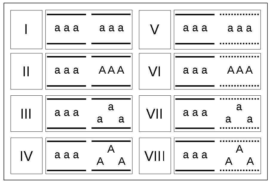 Os estudos do tipo I configuram uma situação na qual os três elementos definidores não podem ser diferenciados. A utilização da letra “a” minúscula nos dois blocos indica a ausência de diferenças entre os indivíduos, enquanto a distribuição linear das letras reflete a ausência de diferenças nas posições ocupadas pelos participantes dos dois grupos. A igualdade dos segmentos de reta, acima e abaixo das letras, indica a ausência de qualquer diferença entre os contextos.