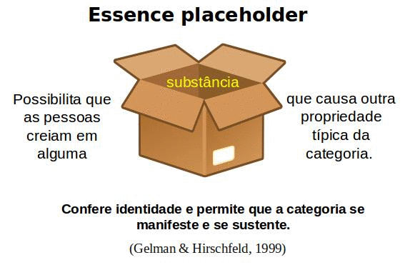 Conforme assinala Gelman (2003; 2004), ainda que não ostentemos crenças precisas sobre a natureza dos membros de um grupo ou categoria social, continuamos a crer que eles possuem uma essência que os define. O raciocínio essencialista depende do acolhimento da noção de que os membros do grupo ou da categoria compartilham uma essência subjacente, não observável, profunda, que não somente define os atributos internos e externos da categoria, mas que também oferece os elementos definidores que permitem a inclusão do indivíduo como membro da categoria ou grupo social. E isso, conforme assinala o modelo do essence placeholder, não exige qualquer tipo de evidência empírica (Medin, & Ortony, 1989).