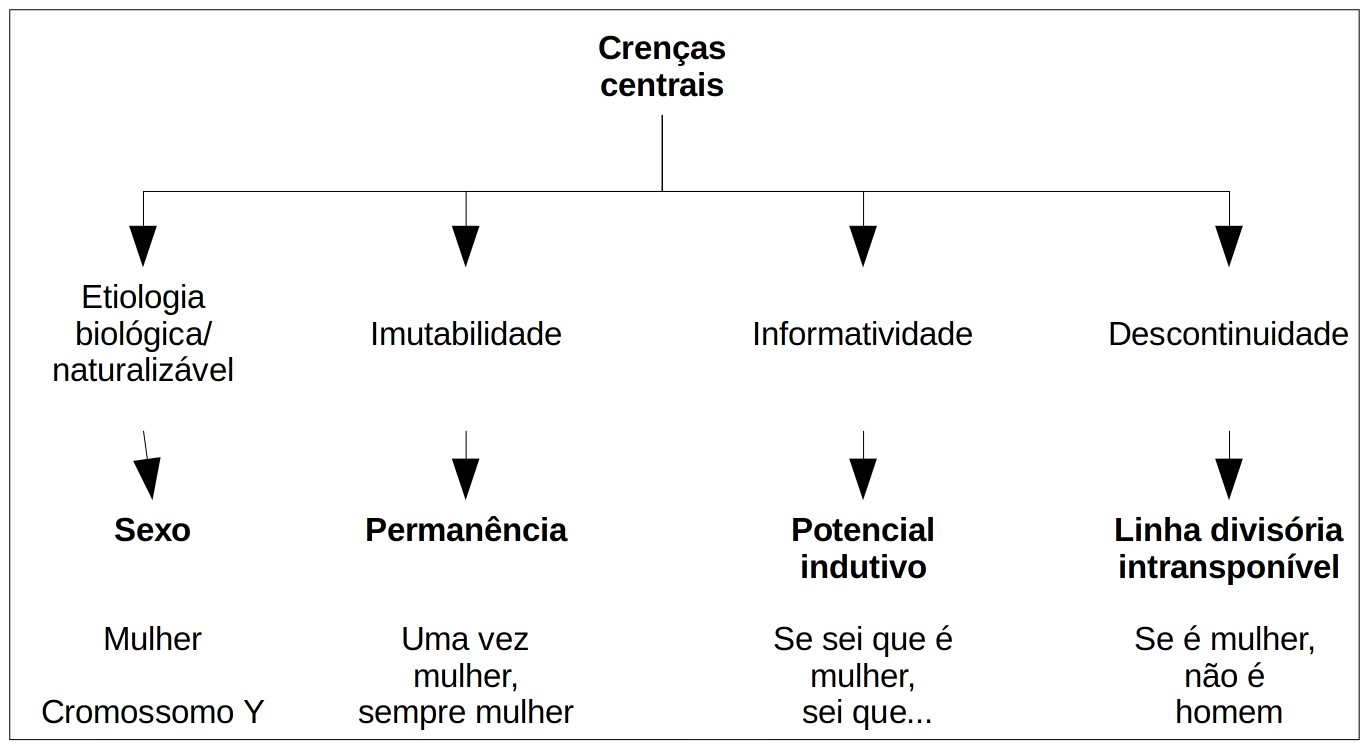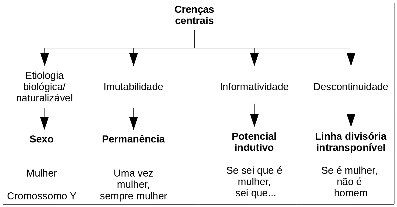 Ainda que as manifestações sejam variadas, a literatura especializada apresenta uma série de evidências teóricas e empíricas de que a formulação básica do essencialismo psicológico se sustenta em quatro crenças fundamentais, destacadas na figura 107. Consideremos, para fins de exemplo, a essencialização das mulheres. A primeira dessas crenças, a da etiologia biológica da categoria, sustenta as formas mais conhecidas de naturalização das essências. Por essa via, as diferenças entre os sexos supostamente se sustentam em uma estrutura biológica, no caso específico, o cromossomo Y; na ausência dele, nenhum indivíduo pode ser incluído na categoria das mulheres. É importante salientar que as discussões sobre a identidade de gênero ou sobre a identidade sexual não se confundem com esse padrão essencialista de raciocínio. Essa crença representa a dimensão material que oferece sustentação aos arrazoados essencialistas sobre mulheres e homens (Pereira, Álvaro, & Garrido, 2015).