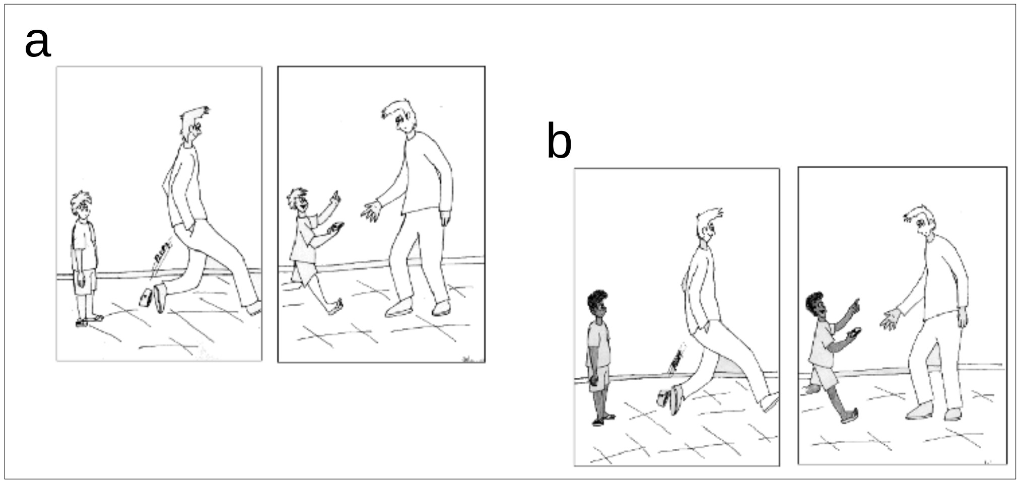 Consideremos a cena apresentada na figura 104, extraída de um experimento conduzido para testar o viés linguístico intergrupal em uma amostra de participantes da cidade de Salvador, Bahia (Pereira, Fagundes, Silva, & Takei, 2003; Pereira, Silva, Fagundes, & Takei, 2003). As imagens a e b são idênticas, exceto por um detalhe, as características fenotípicas do garoto retratado na cena.