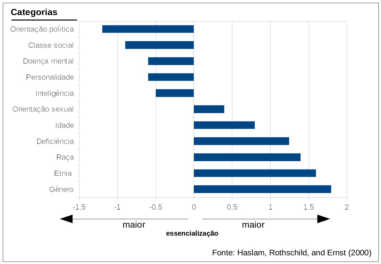 A crença de que as pessoas são dotadas de essências é provavelmente a característica mais marcante da estereotipização de algumas categorias sociais, especialmente daquelas mais facilmente sujeitas ao raciocínio naturalista (Eagly, & Steffen, 1984; Fazio, & Dunton, 1997; Gaertner, & McLaughin). Em uma importante revisão dos estudos empíricos, Haslam, Rothschild e Ernst (2000) sintetizam o nível de essencialização ao qual é submetido cada uma das principais categorias sociais. O gráfico da figura 108 não deixa dúvidas acerca do impacto do pensamento categórico na essencialização do gênero, da etnia e raça, indicando, adicionalmente, que outras categorias como as subordinadas à orientação política e à doença mental não estão sujeitas ao mesmo padrão de essencialização do que as previamente citadas.