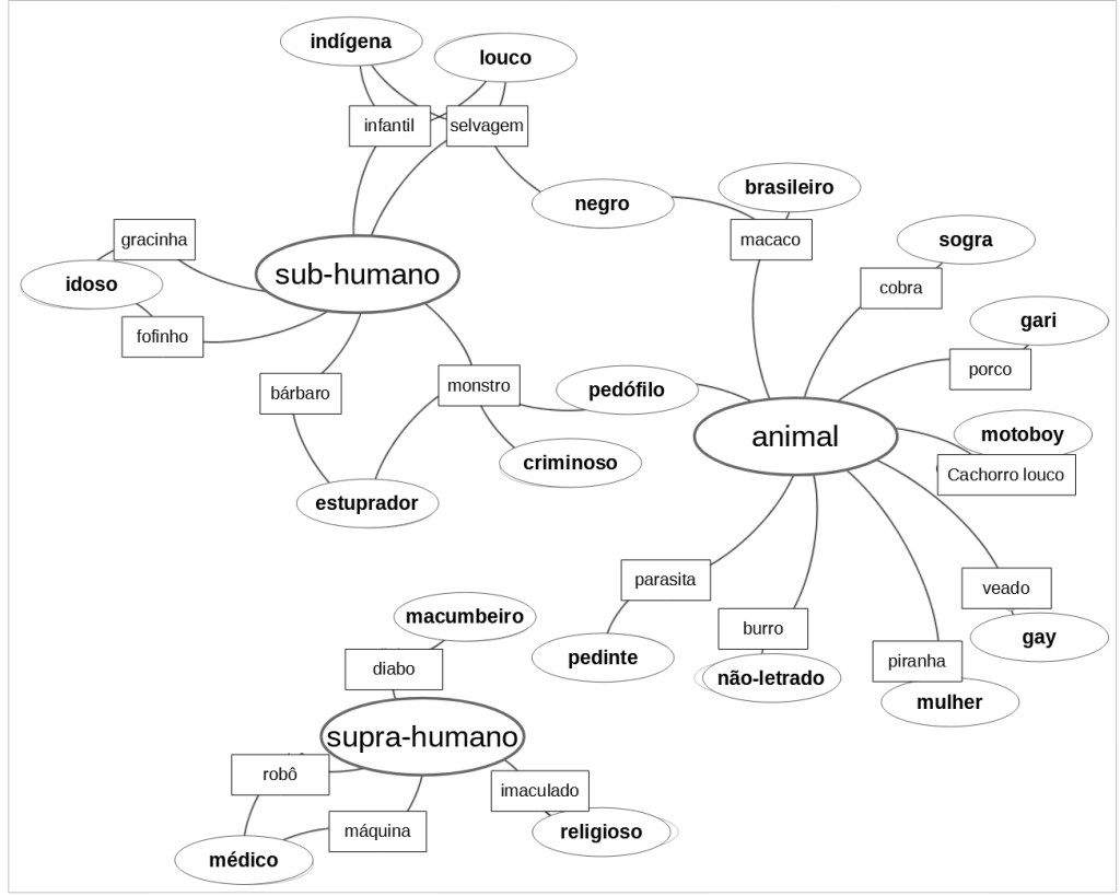Uma forma básica de desumanização se refere à animalização. Ilustramos, no gráfico, algumas formas de expressão comumente utilizadas na nossa linguagem cotidiana para estabelecer essa aproximação entre a representação animalizada e algumas categorias sociais. Um exemplo é o termo cobra, utilizado com uma certa frequência para se referir às pessoas de má índole, perversas e traiçoeiras. Trata-se de um termo desqualificador, facilmente substituído por outros substantivos como víbora ou passível de ser utilizado como adjetivo no caso da expressão ‘língua viperina’. Qual seja a acepção, trata-se de desqualificar a categoria e, como tal, é um processo que não difere da utilização de termos como parasita para se referir aos pedintes, macaco como referência aos negros no Brasil ou aos brasileiros em outros países da América Latina, ou a expressão “cachorro louco” usada como referência aos motoboys.