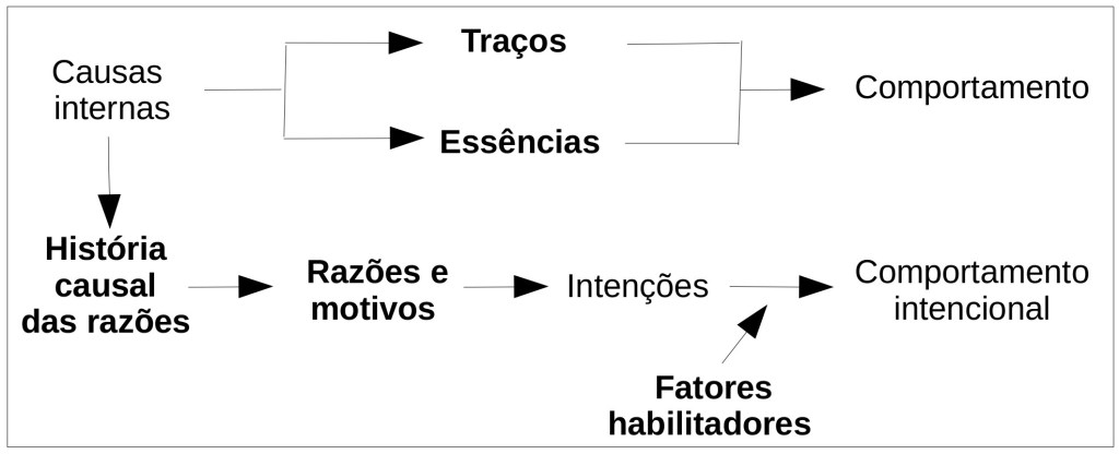 Uma vez que nem toda intenção pode ser transformada diretamente em ação, as explicações folk fundamentadas na noção de intencionalidade do agente assumem três formulações distintas conforme se observa no diagrama da figura 111.