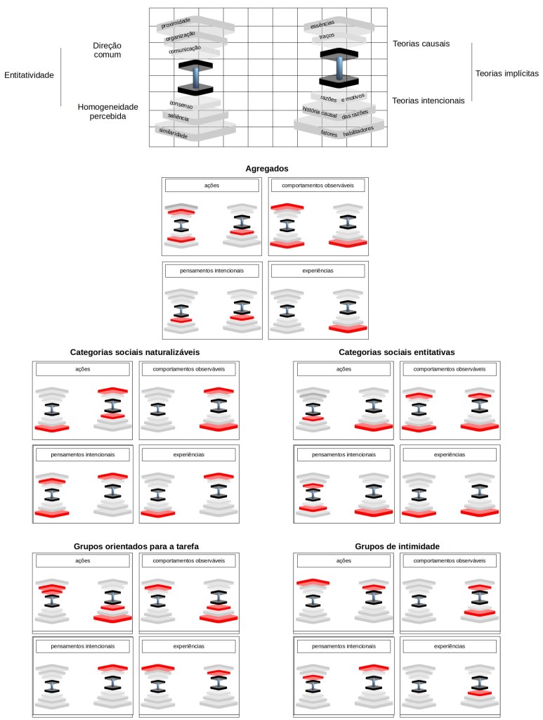A figura 119 representa as dimensões do modelo dos acoplamentos alternados, indicando os elementos sujeitos à ativação durante a elaboração de relatos estereotipados. Na parte superior podem ser identificados os elementos conceituais relacionados com as duas dimensões básicas, a entitatividade (homogeneidade percebida e direção comum) e as teorias implícitas (teorias causais e teorias intencionais). Na região inferior da figura encontramos os acoplamentos relativos a cada um dos eventos mentais nos quais os entes sociais encontram lugar. Por exemplo, o início do relato pode fazer referência a uma ação conduzida por um agregado, sendo possível identificar um acoplamento entre dois elementos entitativos, a organização e a saliência e um determinante causal, a alusão a traços psicológicos. Na sequência, o relato pode deixar de aludir ao agregado e passar a considerar os pensamentos intencionais de um indivíduo referido como membro de uma categoria social entitativa, fazendo com que o acoplamento conheça uma alternância e passe a vigorar uma formação em que estejam incluídos os fatores entitativos comunicação e saliência e a explicação intencional fundamentada nos fatores habilitadores.