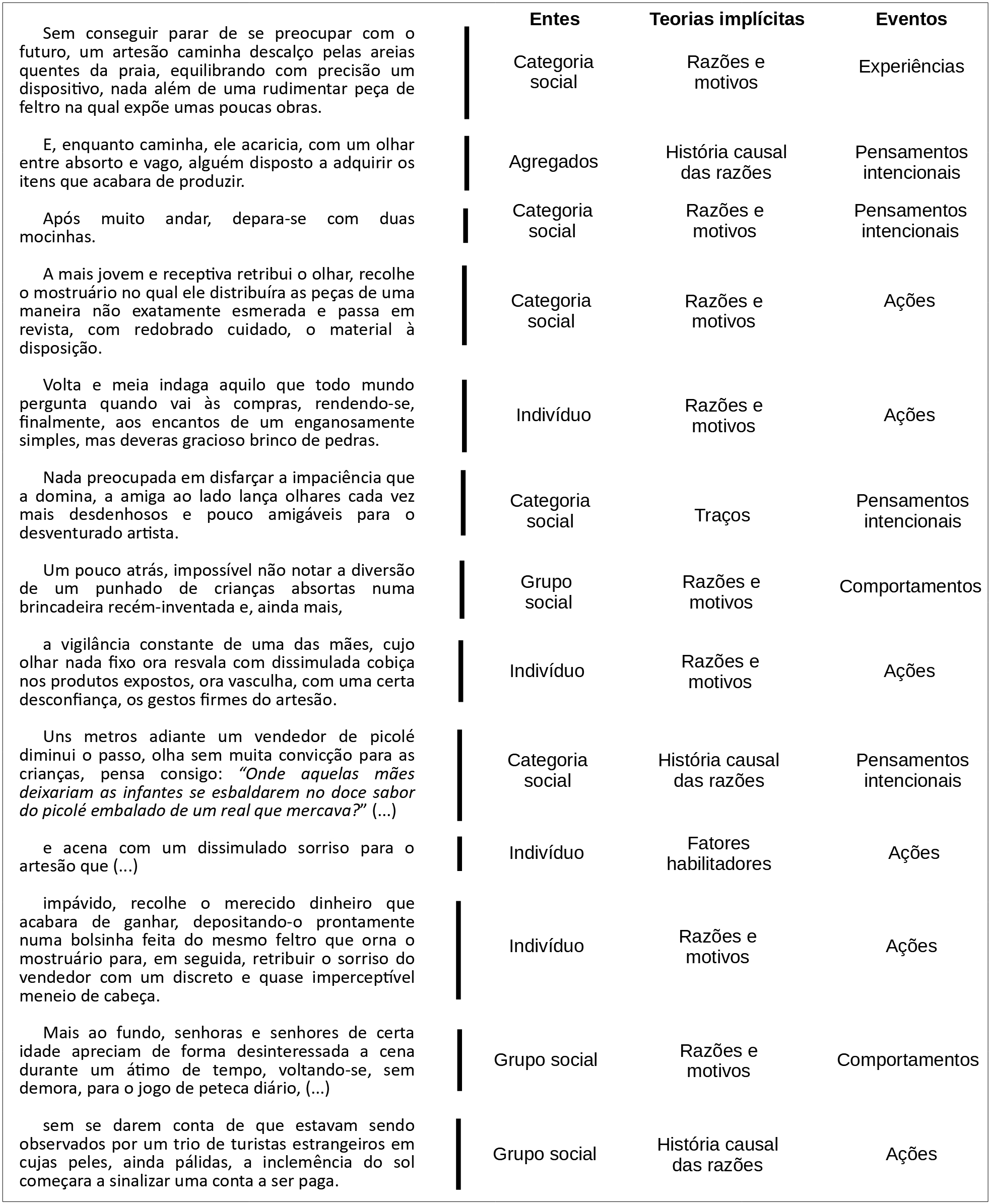 No quadro 19 retomamos a história apresentada na abertura da obra e a segmentamos para especificar, cena a cena, os indicadores relativos à entitatividade, às teorias implícitas e aos eventos mentais. A narrativa especifica as alternâncias na narrativa, acentuando a importância em considerar os dinamismos inerentes às interações humanas..