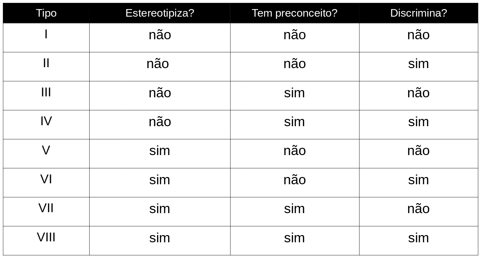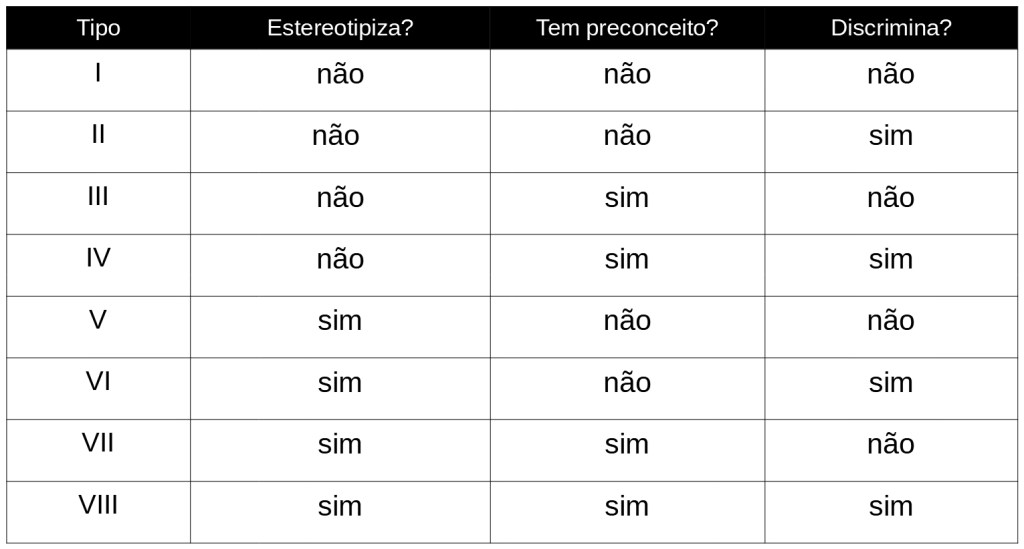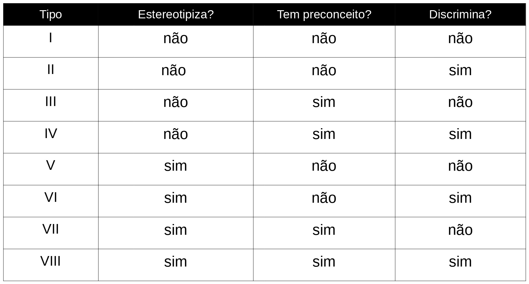 Na condição de professores universitários e pesquisadores na área dos estereótipos, frequentemente somos convidados a participar de eventos acadêmicos nos quais uma questão sempre se mostra presente: qual a possibilidade de combater ou fazer frente aos estereótipos e preconceitos? No capítulo 3, ao discutirmos os primeiros estudos cientificamente orientados sobre os estereótipos, assinalamos que este campo de estudos surge a partir do sentimento de muitos estudiosos de que o conceito de estereótipos aludia a um julgamento impróprio e indevido que, em última instância, acarretava a desvalorização ou a desqualificação injustificada de uma categoria ou grupo social. Ainda que posteriormente os estudos tenham se encaminhado no sentido de indicar que o julgamento estereotipado pode ser qualificado como um processo psicológico rotineiro, o termo preservou a conotação negativa com a qual se revestiu inicialmente, ao tempo em que a preocupação utilitária em oferecer meios para enfrentá-los permaneceu uma marca registrada do nosso campo de estudos. O problema mais grave não é o de nos sentirmos obrigados a responder a uma mesma questão, mas sim a de que quase sempre é exigida uma resposta incondicional, como se o combate aos estereótipos, aos preconceitos e à discriminação não fosse matizado por nuances e particularidades. A presente seção não representa uma tentativa de responder a esta questão, pois o máximo que nos permitimos é assinalar a complexidade de tratamento por ela exigido. Ao considerarmos, por exemplo, as possibilidades lógicas inerentes às relações entre estereotipizar ou não, acolher ou não preconceito, discriminar ou não, contamos com oito alternativas, identificadas no quadro 21.