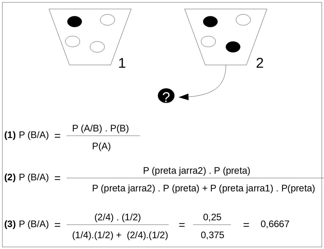 Identifiquemos no diagrama os elementos considerados na solução do problema. Comecemos com um elemento crítico nos ácidos debates entre bayesianos e frequentistas, a probabilidade a priori (P(B), algo que sabemos de antemão e que independe de qualquer informação prévia acerca da distribuição das pedras nas jarras. E qual é a nossa crença a priori? A de que a pedra é branca ou preta, ou seja, a probabilidade a priori de qualquer uma delas ser escolhida é de 1/2. O teste bayesiano sempre depende de uma crença a priori, enquanto o frequentista considera inaceitável a inclusão de qualquer elemento desta natureza por entender que esta operação representa a introdução de critérios subjetivos no cálculo de probabilidade e, de fato, a decisão do critério a priori, uma prerrogativa do pesquisador, determina o resultado da análise. Consideremos um outro elemento, a probabilidade condicional de B dado A, isto é, a probabilidade de tirar uma pedra preta da jarra 2 onde, sabemos, estão contidas duas pedras pretas e duas pedras brancas. Esta probabilidade como visto no numerador encontrado em (3) é 2/4. O terceiro elemento do modelo é uma constante de normalização, englobando, como pode ser visto no denominador de (3), todas as condições possíveis do modelo, tal seja, a soma dos produtos das probabilidades conhecidas de cada jarra (1/4 para a jarra 1 e 2/4 para a jarra 2), multiplicadas pelas probabilidades a priori que sabemos ser 1/2. O resultado final, 0,667, ou 2/3, nos informa a probabilidade de que a pedra preta tenha sido sacada da segunda jarra.