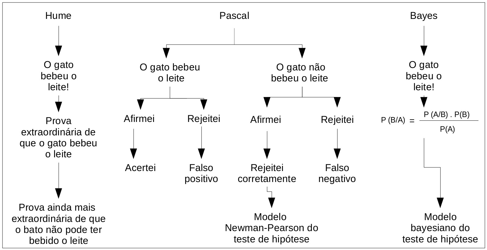 Estes modelos estão associados a três importantes pensadores, o teólogo e matemático francês Blaise Pascal (1623-1662), o pastor presbiteriano e estatístico inglês Thomas Bayes (1701-1761) e o filósofo empirista inglês David Hume (1711-1776), ao qual nos referimos ao discutir o iluminismo. Consideremos, no diagrama encontrado na figura 123, as influências das ideias de cada um destes autores, enfatizando que apesar das diferenças de orientação, estas tradições de pensamento se irmanam em um objetivo comum, oferecer respostas ao problema da credulidade.