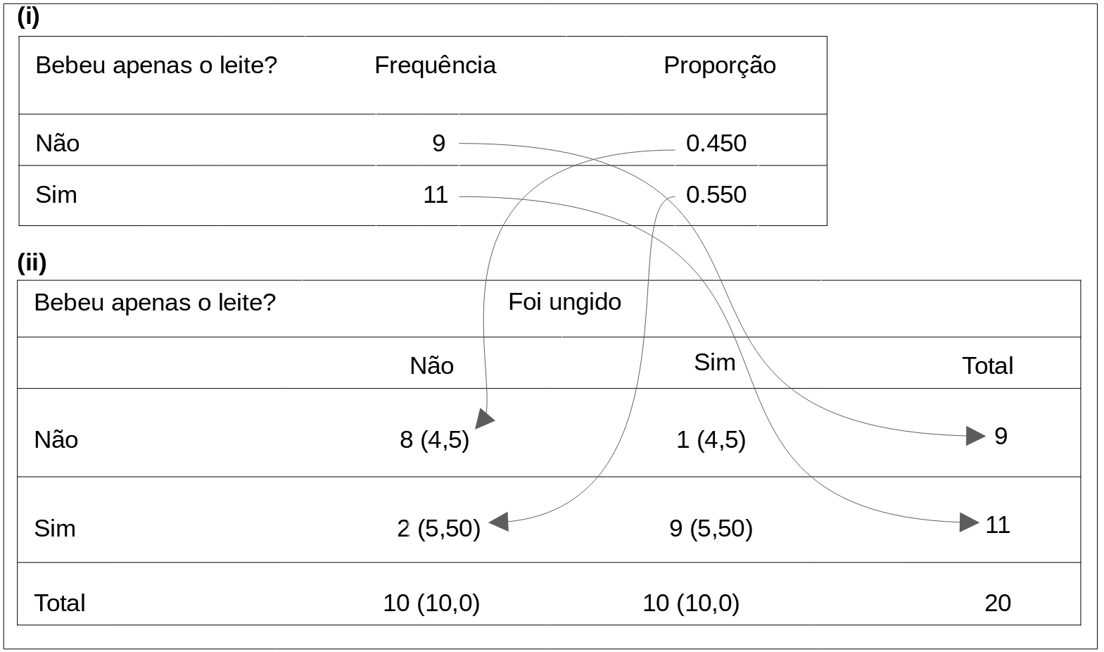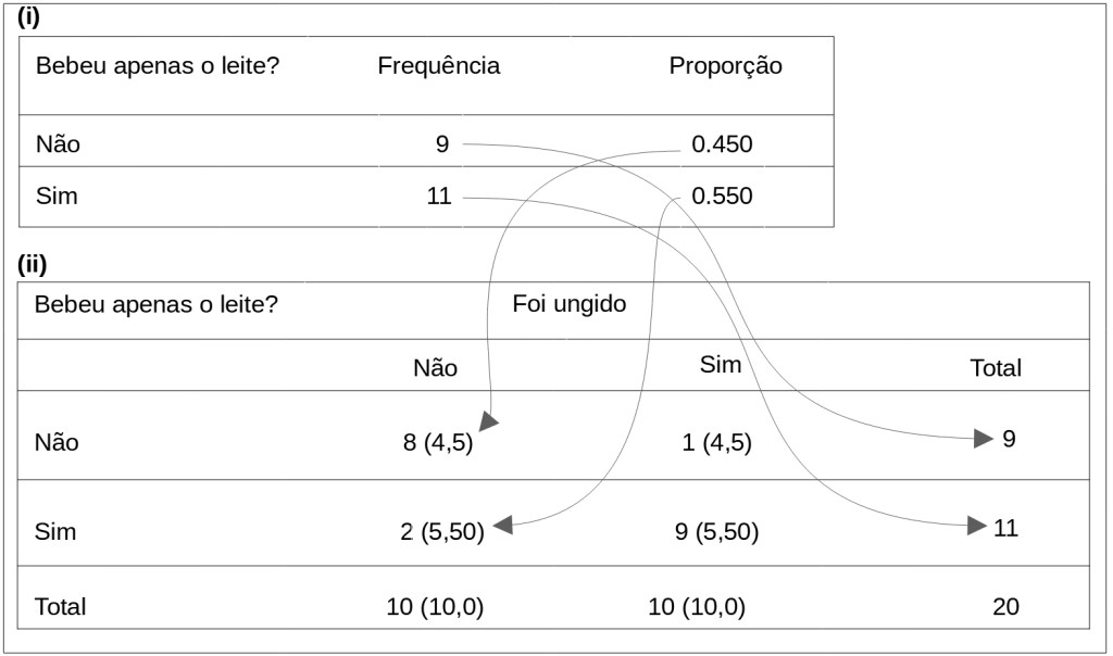 A condução de um novo teste, desta vez respeitando a alocação aos dois grupos, evidencia um cenário algo diferente. A lógica do teste foi discutida na seção 3.2 ao apresentarmos o estudo de Rice, mas não custa assinalar que o mais decisivo é analisar as discrepâncias entre o valor esperado por acaso e a frequência registrada em cada uma das células encontradas na tabela (ii) da figura 125. Caso fosse respeitada a proporção esperada ao acaso, contaríamos que, em média, 4,5 gatos não ungidos deveriam beber apenas o leite, enquanto esperaríamos que 5,5 gatos ungidos tivessem bebido apenas o leite. As linhas encontradas ligando as tabelas (i) e (ii) indicam a origem dos valores esperados e registrados.