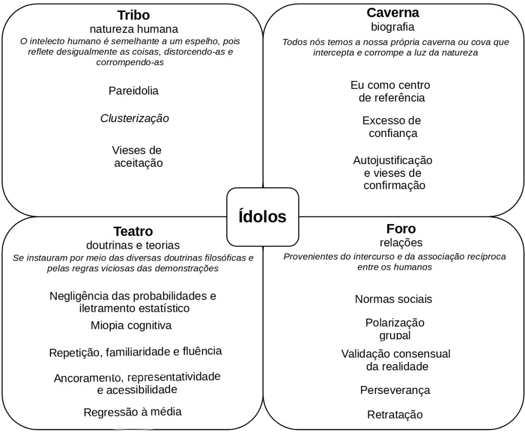 Aceitar informações enganosas, notícias falsas e atribuir valor de verdade a boatos e rumores é mais comum do que ousamos admitir, donde a necessidade de nos precaver contra as armadilhas às quais o nosso raciocínio se encontra sujeito. Na presente discussão adotaremos a classificação dos ídolos exposta anteriormente e, a partir da diferenciação estabelecida por Francis Bacon, discutiremos uma série de paralogismos, tendências, heurísticas e vieses a que estamos submetidos e que podem nos levar a acolher conclusões injustificadas, errôneas e ilusórias. Faremos uma breve exposição sobre cada um dos constructos, articulando-os, grosso modo, aos quatro tipos de ídolos postulados por Francis Bacon.