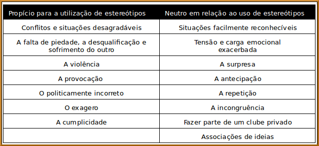 Mesmo os roteiristas e escritores dispondo de inúmeras soluções que podem ser utilizadas na elaboração de peças de humor neutras em relação aos estereótipos, assistimos uma profusão mais do que exagerada de conteúdos estereotipados e preconceituosos nas comédias, séries e espetáculos humorísticos. Será o humor não preconceituoso menos engraçado do que o preconceituoso? Os humoristas estão corretos ao assinalarem que apenas oferecem o solicitado pelo público? A elaboração de argumentos humorísticos com base em técnicas como a repetição, a surpresa, o uso de situações facilmente reconhecíveis, assim como outras incluídas na segunda coluna do quadro, poderia proporcionar a produção de peças de maior qualidade e menos estereotipadas. Os roteiristas, no entanto, preferem adotar técnicas de elaboração de anedotas e situações de humor muito menos neutras em relação ao uso de conteúdos estereotipados ou preconceituosos.