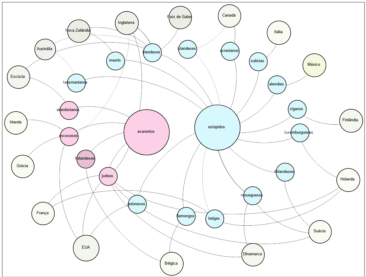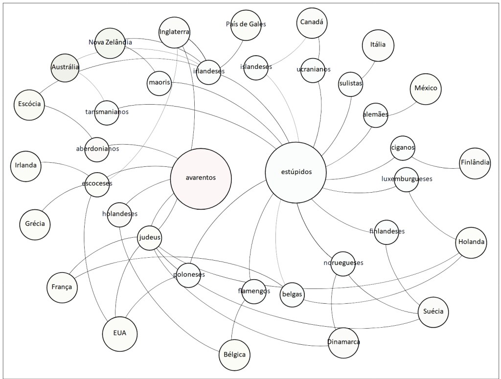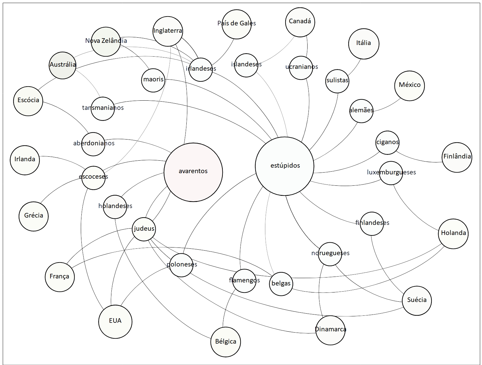 Davies (1982), ao assinalar o esquema mental que preside a elaboração das anedotas étnicas, indica a presença frequente de duas representações estereotipadas bastante comuns a respeito dos grupos-alvo, ora retratados como estúpidos, ora como avarentos. A partir das evidências apresentadas no artigo de Davies elaboramos um grafo no qual estão representadas as relações entre o conteúdo das anedotas, a categoria nacional ou regional à qual a anedota se refere e o local onde a anedota foi registrada.