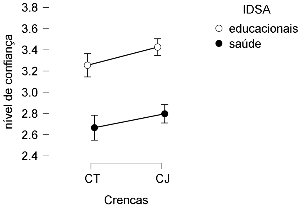 Conforme observado, acolher um sistema de crenças cientificamente justificado representa desvalorizar as IICC, ao tempo em que acolher um CT está associado com uma maior valorização das IDSA. Em contrapartida, a confiança nas IRPS não é afetada pelo sistema de crenças, pois a avaliação permanece sempre alta nos participantes alocados aos dois sistemas de crenças.