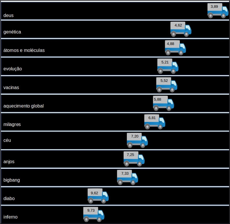 Solicitamos aos participantes que ordenassem as doze crenças acima listadas em ordem de importância. Os resultados, registrados na figura 1, deixaram claro que a crença em deus foi considerada a mais importante para a maioria dos respondentes. Na sequência, os participantes posicionaram quase todas as crenças cientificamente justificadas para, finalmente, classificarem as demais crença tradicionais. Duas crenças tradicionais, a no diabo e a no inferno, ocuparam as posições finais, enquanto a crença cientificamente justificada no big bang ocupou um das últimas posições.