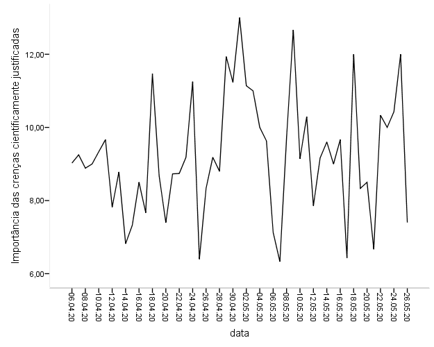 A partir das respostas acima expostas, foram compostos dois indicadores, um relativo à importância dada às crenças tradicionais (CT) e um segundo, obtido a partir da média das posições ocupadas pelas crenças cientificamente justificadas (CJ). Uma vez que as medidas não são independentes uma da outra, consideramos analisar a partir de um dos dois sistemas de crenças, as cientificamente justificadas. O critério adotado para esta decisão foi a comparação entre as médias das posições das seis crenças incluídas em cada um dos sistemas. O teste de Wilcoxon (W = 667702,000 , p <.001; correlação bi-serial das posições = 0,539) permitiu identificar uma diferença significativa na adesão às crenças, apontando uma maior importância atribuída à media das CT (8,935) ao serem comparadas com as atribuídas às CJ (5,065). As respostas relativas à importância das crenças cientificamente justificadas oscilam bastante ao longo dos dias, conforme observado no gráfico encontrado na figura 2.