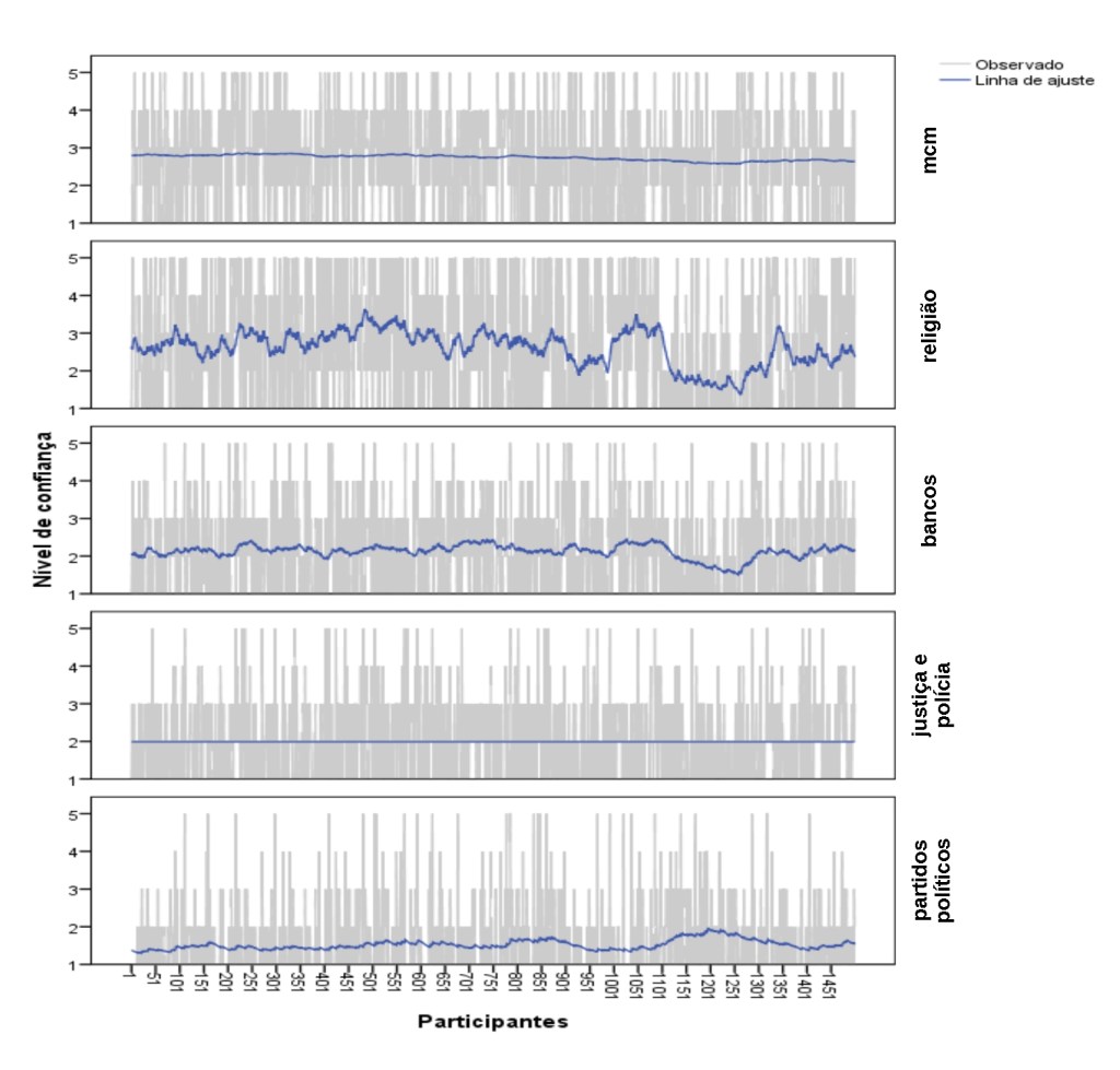 Uma vez que as doze instituições avaliadas pelos participantes foram classificadas em três modalidades, as instituições de referência pessoal e social (IRPS), as instituições dedicadas ao suporte e à assistência (IDSA) e as instituições de imposição do controle e do consenso social (IICC), podemos compará-las em termos de confiança que elas despertam nos participantes. Uma Anova de medidas repetidas indica uma diferença significativa entre as três modalidades (F(2, 880) = 1842,410 , p <.001 , n2 = 0,558), com o teste post hoc apontando que as três diferem significativamente entre si, com as IRPS sendo as mais valorizadas (média = 3,666; dp = 0,780), seguida pela IDSA (média = 3,135; dp = 0,915) e por último as IICC (média = 2,181; dp = 0,694).