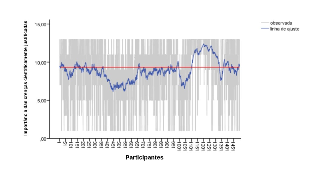 Para avaliar melhor o efeito da passagem do tempo na evolução da confiança nas crenças, aplicamos a rotina Expert Modeller, do Forecasting (SPSS). O resultado, conforme observado no gráfico encontrado na figura 3 evidencia que a confiança nas crenças cientificamente justificadas apresentou alguma oscilação, ora para mais, ora para menos, se compararmos com a linha vermelha, que serve como critério de referência.
