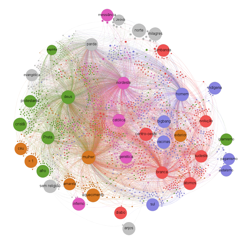 As relações entre as crenças e algumas variáveis sociodemográficas podem ser observadas no grafo obtido mediante a utilização do aplicativo Gephi, layout Force Atlas 2, conforme observado na figura 5.