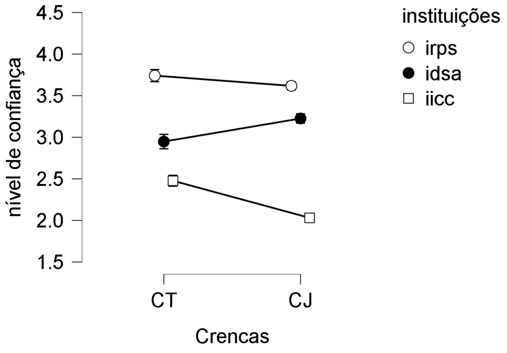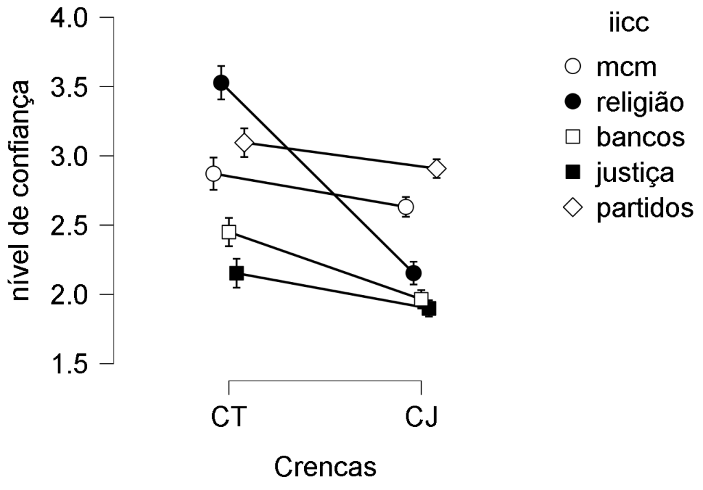 O elemento mais evidente se refere à diferença na inclinação da linha relativa às instituições religiosas, pois mesmo que nas demais instituições possamos identificar uma queda na confiança nas instituições entre os participantes que acolhem os CJ quando comparados aos CT, este efeito é muito pronunciado no caso da religião e, um pouco menos, mais ainda assim saliente, no caso dos bancos e instituições financeiras.