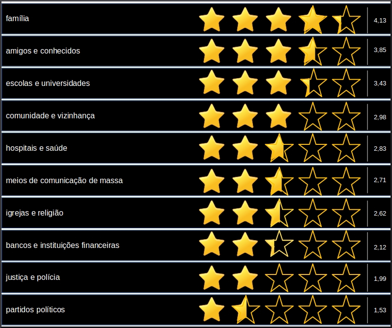 O segundo objetivo do nosso estudo foi avaliar a confiança em algumas instituições. Utilizamos uma escala gráfica na qual o participante foi solicitado a indicar o quanto confia em cada instituição, atribuindo, a cada uma delas, entre uma estrela, quando confiava muito pouco, a cinco estrelas, o indicador do grau de confiança máxima. A média de avaliação em cada uma das instituições pode ser visualizada na figura 6.