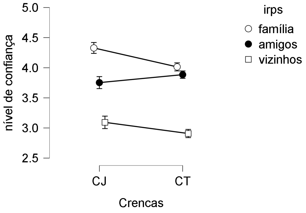 Uma vez que as instituições foram agrupadas em categorias mais ampla, e este agrupamento pode trazer distorções nas análises, é importante considerar cada instituição incluída nas três modalidades acima diferenciadas.O impacto dos sistemas de crenças em cada uma das IRPS pode ser visualizado na figura 13, no qual se evidencia, de imediato, que a inclinação da linha relativa à confiança na instituição amigos difere da observada nas outras duas, pois foi a única na qual a confiança é mais alta entre os que acolhem as CJ. A instituição família apresenta uma tendência oposta, sendo mais valorizada pelos que acolhem as CT. A instituição comunidade e vizinhança foi a única, dentre as três IRPS, que não apresentou diferenças associadas com os sistemas de crenças.
