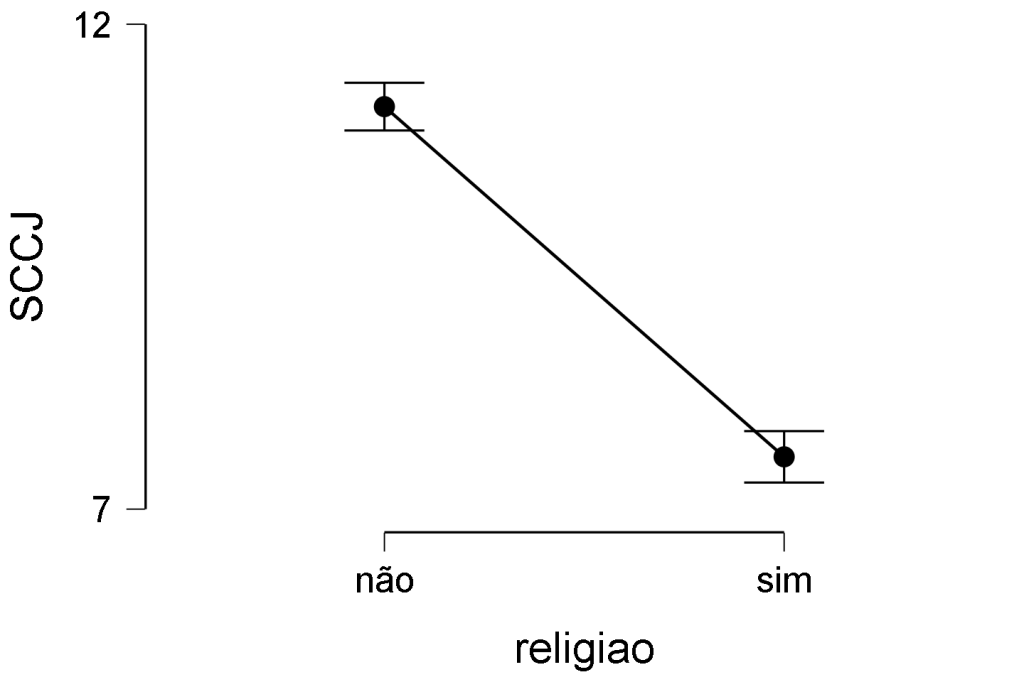A adesão a uma religião também exerceu um efeito importante, pois a média de adesão das pessoas que não acolhem nenhuma religião foi substancialmente superior (11,150; dp = 2,932) do que as identificada entre os que informaram aderir a algum credo religioso (7,539; dp = 3,642), sendo esta diferença entre as médias significativa do ponto de vista estatístico (Mann-Whitney = 316235,000 , p <.001; tamanho de efeito = 0,596). Para fins de comparação, consideremos uma outra medidas, a religiosidade, obtida numa escala de 11 pontos, com valores mais alto indicando maior religiosidade. A aplicação de uma correlação bivariada identificou uma correlação negativa entre o nível de religiosidade do participante e o acolhimento das CJ (rho de Spearman = -0,555 , p <.001).
