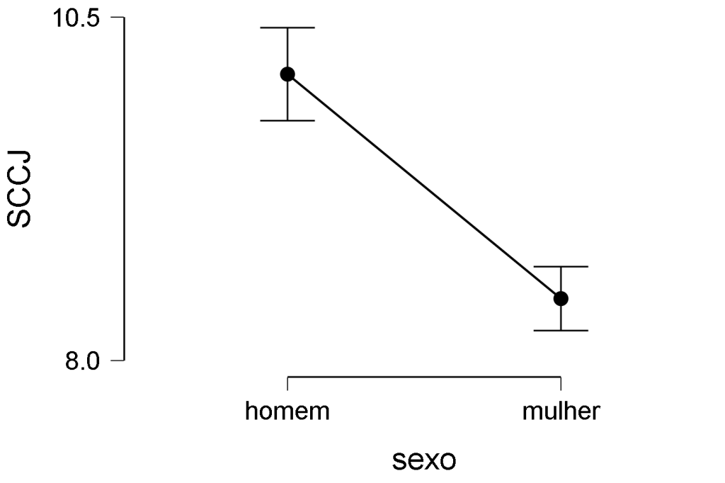 Uma vez que as crenças estão fortemente associadas com o grupo de referência de quem as acolhe, conduzimos uma série de análises relativas ao impacto de algumas variáveis sociodemográficas na adesão às crenças. Foi possível identificar, por exemplo, que os homens aderem mais às CJ do que as mulheres (média 10,08 x 8,45; Mann-Whitney = 296062,000 , p <.001; tamanho de efeito = 0,271). Além da variável sexo, a variável idade também mostrou uma associação com o adesão às CJ, identificando-se uma correlação negativa (rho de Spearman = -0,150 , p <.001), o que sugere uma relação sistemática entre o envelhecimento e o abandono das crenças cientificamente justificadas.