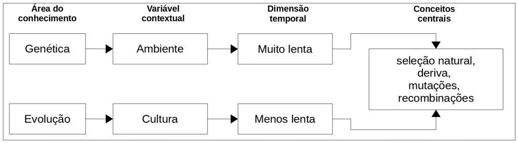 Estas tendências, ainda que não possam ser estimadas de maneira precisa no que concerne às condutas individuais, certamente se insinuaram na nossa história evolutiva, embora não tenhamos clareza quanto às relações entre os determinantes genéticos e os processos evolutivos. O princípio geral que ordena esta discussão se inscreve na denominada teoria da herança dual cujos fundamentos básicos procuram especificar de que maneira ocorre a evolução do patrimônio genético e o quanto esta evolução se assemelha e difere da evolução cultural (Boyd, & Richerson, 1985; Feldman, M., & Cavalli-Sforza, 1976). As diretrizes orientadoras desse modelo interpretativo no domínio específico da cooperação humana estão apresentadas na figura 75, onde podemos identificar que o impacto da genética é bem mais lento do que o da evolução cultural.