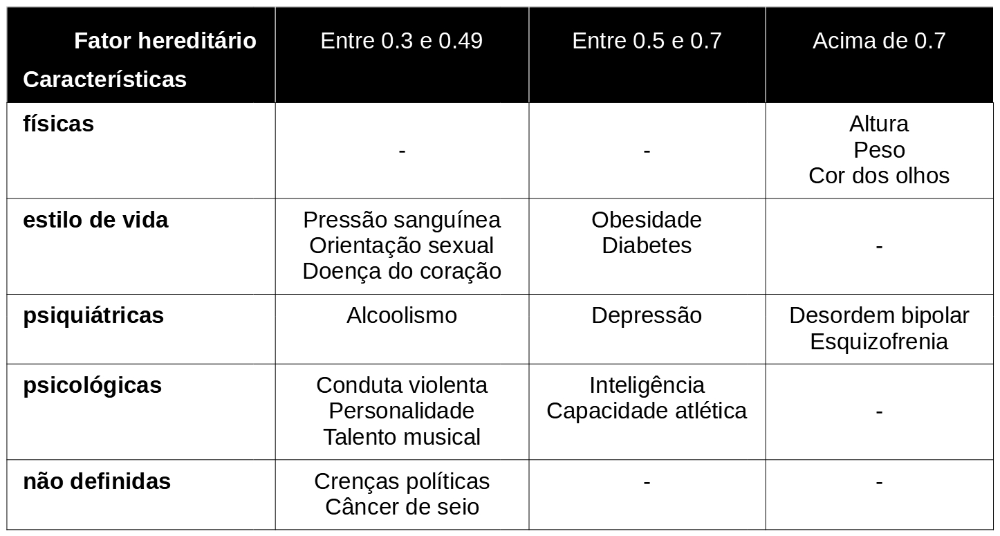 Algumas características físicas como a altura, o peso ou a cor dos olhos apresentam um fator de hereditariedade muito alto, bem acima do ponto de corte de 0,7, sendo mais bem explicadas pela genética do que as características de outra natureza. Além disso, a correlação entre a atribuição dos fatores genéticos por pesquisadores e por pessoas leigas a este tipo de característica é muito alta, favorecendo a interpretação de que o conhecimento genético tem sido bem acolhido pelo senso comum. Outras características como o câncer de seios ou a orientação sexual possuem um fator de hereditariedade bem mais alto entre os leigos do que o apontado pela pesquisa científica, o que pode ser entendido como um indicador de que, embora em algumas circunstâncias as explicações leigas para a influência da genética possam ter alguma acurácia, muitas vezes o poder atribuído aos genes é exagerado.