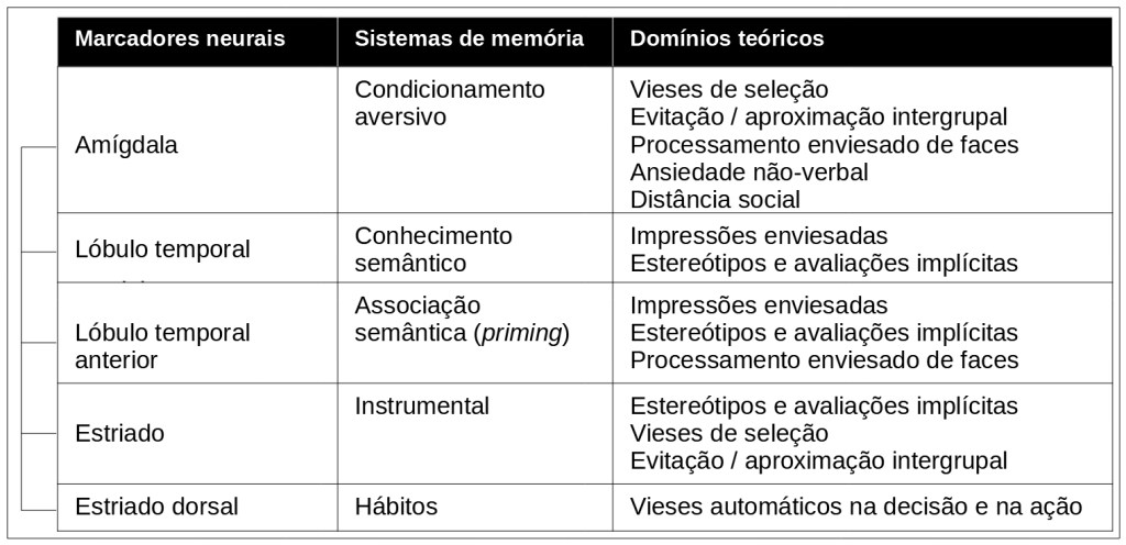 O rápido desenvolvimento dos estudos relativos à neuropsicologia dos estereótipos e preconceitos possibilitou a formulação de alguns modelos teóricos gerais, embora estes estudos continuem a ser orientados por uma preocupação claramente individualista como, por exemplo, os desenvolvimentos oriundos dos campos de estudos da neuropsicologia da memória e da aprendizagem. Consistente com o conceito de interconexão, podemos identificar no modelo, além dos cinco marcadores neurais exemplificados na tabela, as conexões por eles estabelecidas e os vínculos mantidos com os distintos sistemas de aprendizagem.
