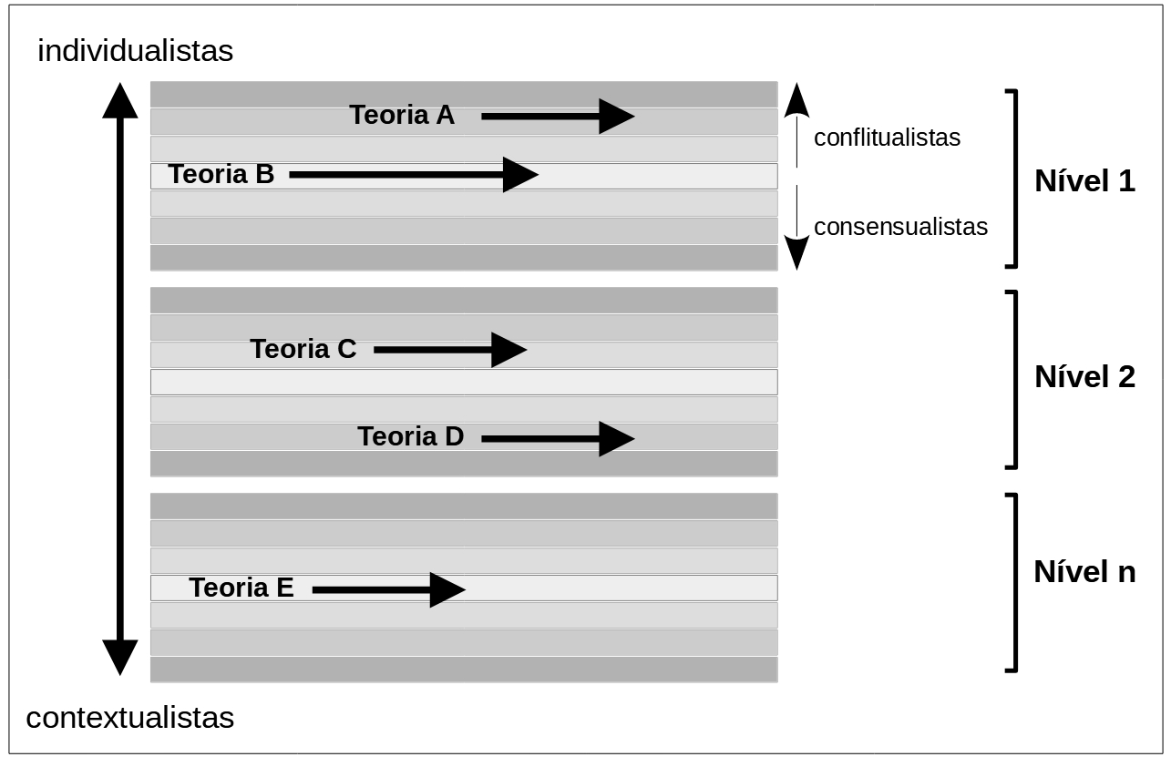 Em torno destes dois eixos, se mais individualistas ou contextualistas e se adotam uma perspectiva consensualista ou conflitualista, as teorias e hipóteses podem ser distribuídas de acordo com o nível privilegiado de investigação. Assinale-se, no entanto, que a inclusão de uma teoria ou hipótese numa determinada rubrica não deve ser interpretada como o favorecimento exclusivo daquela perspectiva.