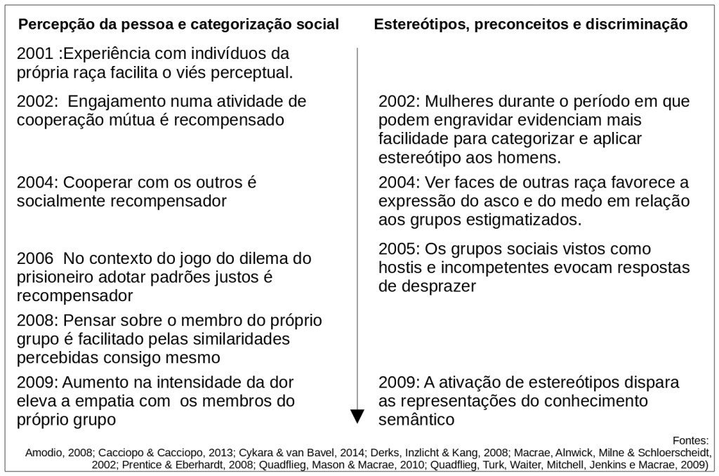 Um vasto repertório de evidências foi obtido ao longo da primeira década do século XX, tal como se observa na figura 77, onde representamos graficamente a evolução temporal de alguns dos principais achados associados aos temas da percepção do outro e categorização social dispostos no lado esquerdo e dos estereótipos e das atitudes preconceituosas apresentados à direita.