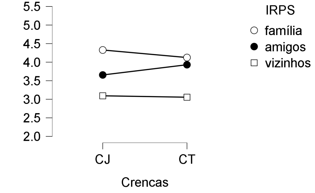 Os resultados confirmam a hipótese, tal como se observa no gráfico abaixo, no qual se evidencia que os participantes classificados como CT embora confiem mais nas IRPS do que os que acolhem um sistema de crenças cientificamente justificadas (F (1.973, 1541.608) = 24,015 , p <.001; correção Greenhouse-Geisser), este efeito se manifesta apenas em relação às instituições família e comunidade/vizinhança. Numa direção oposta, o gráfico evidencia que a confiança nos amigos/conhecidos é mais alta entre os participantes que acolhem um sistema de crenças cientificamente justificado do que entre os que acolhem as crenças tradicionais