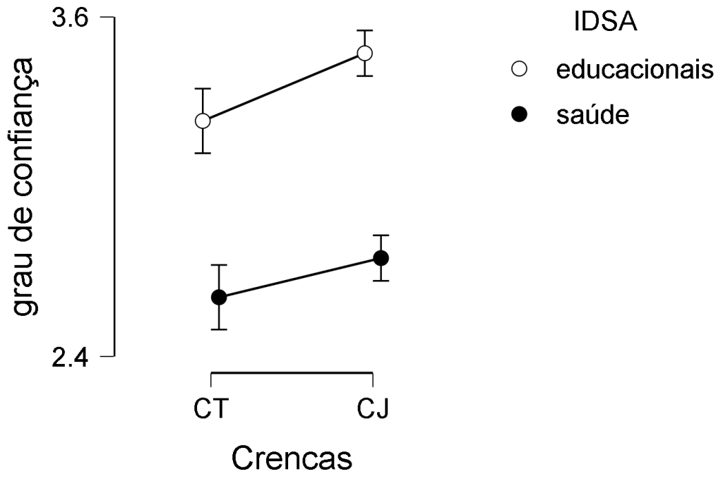 Os resultados confirmaram a hipótese, uma vez que foi identificado um efeito principal dos sistemas de crenças (F (1, 1177) = 21,624 , p < 0.001) e um outro multivariado das duas instituições (F (1,1177) = 321,815 , p <.001). A análise do gráfico plotado na figura abaixo não parece indicar diferenças na avaliação das IDSA entre os participantes classificados como CJ ou CT, o que se confirma pela ausência de interação entre as variáveis incluídas na ANOVA (F (1,1177) = 0,040 , p =0.841).