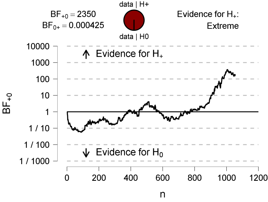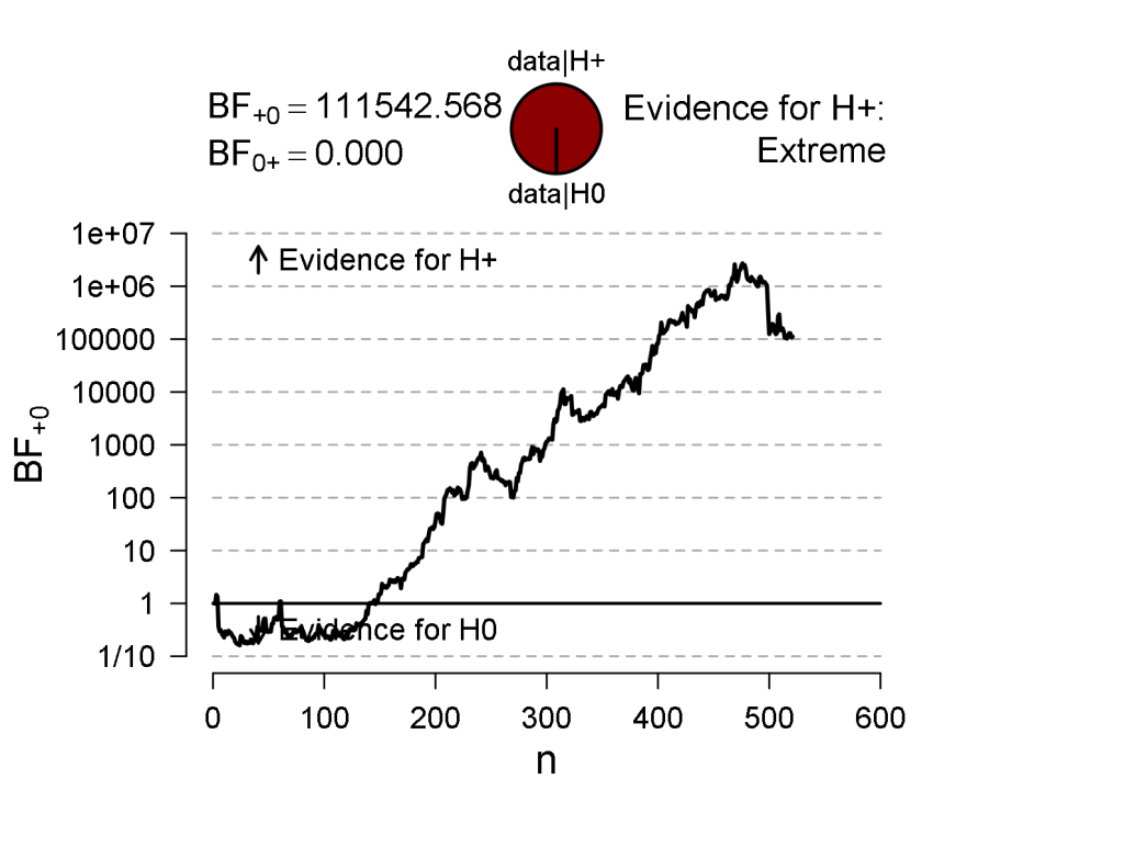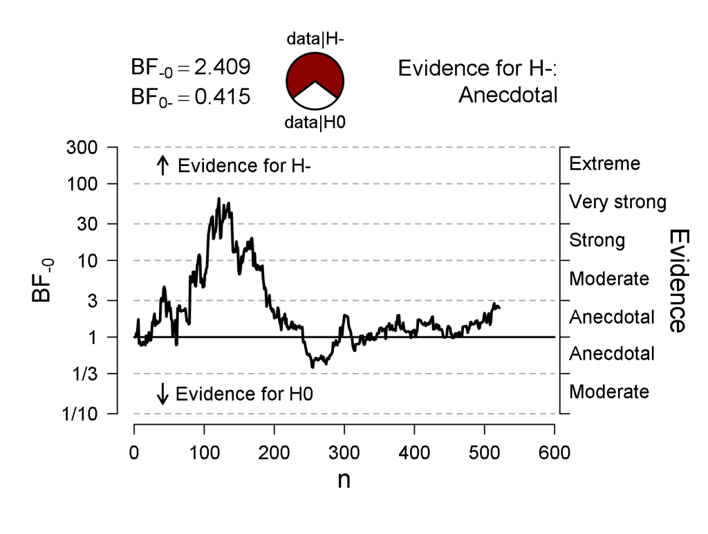 A direção da associação entre as variáveis foi compatível com o postulado pela hipótese, com o coeficiente de correlação estatisticamente significativo (r = -0.109 , p = 0.006). A análise bayesiana sequencial mostra, no entanto, que embora os valore sejam estatisticamente significativos, a evidência obtida foi apenas anedótica (BF = 2, 409), conforme observado no gráfico abaixo.