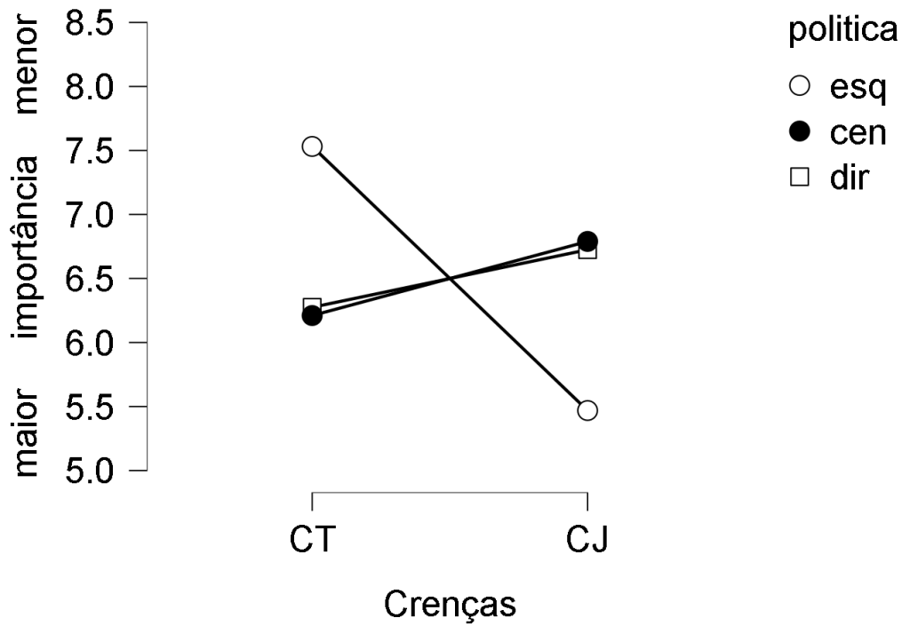 O resultado da ANOVA de medidas repetidas (F(2,511) = 25,785 p <.001) indica uma interação entre a orientação política e os sistemas de crenças. Conforme observado no gráfico abaixo, os participantes que se definiram como de esquerda tendem a dar mais importância às crenças cientificamente justificadas (CJ), enquanto os participantes de direita encaminham as suas respostas numa direção inversa, preferindo as crenças tradicionais (CT). É importante notar que os participantes que se caracterizaram como de centro apresentaram um padrão de resposta muito semelhante aos que se definiram como de direita.