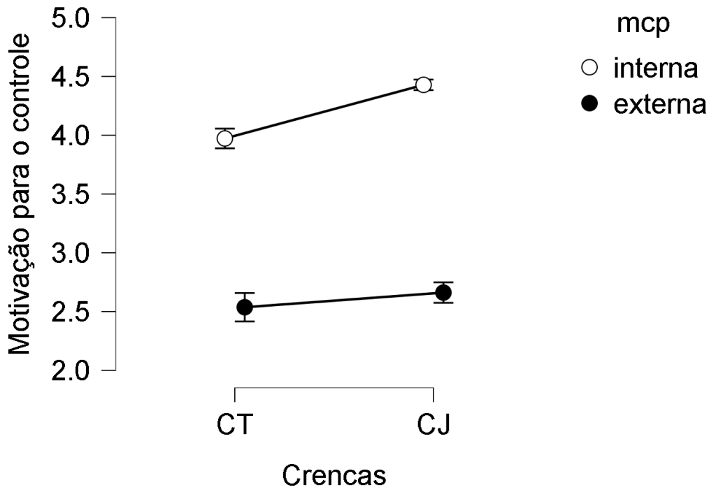 Os resultados corroboraram a hipótese 27, pois não apenas o escore da mci foi maior do que o da mcp entre os dois tipos de participantes ( F (1,1074) = 1592,913 , p <.001), como também foi possível identificar um efeito de interação entre a motivação para o controle do preconceito e o sistema de crenças (F(1,1074) = 17,062 , p < .001), o que também corroborou a hipótese 28, uma vez que, especialmente no caso da mci, os participantes alocados ao CJ obtiveram escores mais altos do que os CJ.