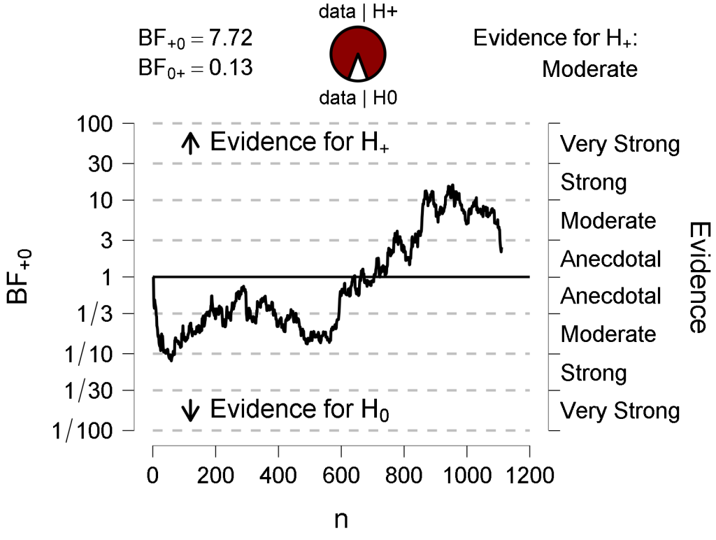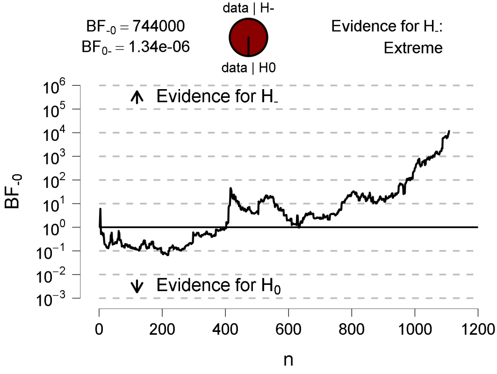 Foi identificada um coeficiente de correlação negativo entre as duas variáveis (r = -0,169 , p < 0.001). A análise sequencial, apresentada na figura abaixo, corrobora a hipótese 31 e evidencia um efeito consistente compatível com a hipótese com a inclusão de novos dados (BF = 744000).