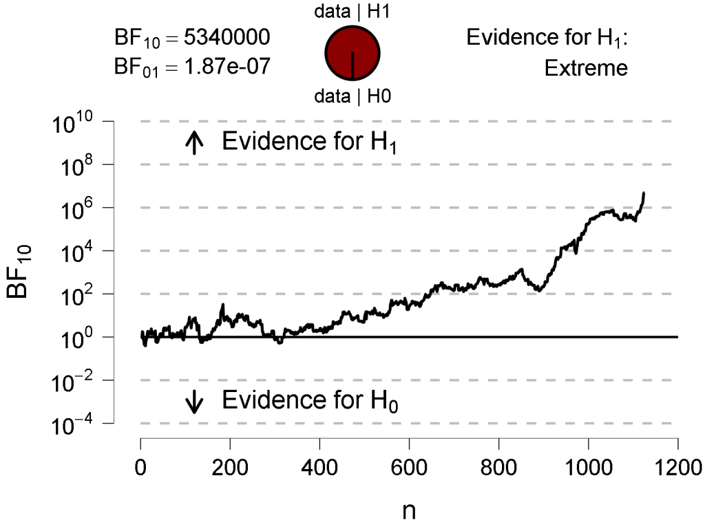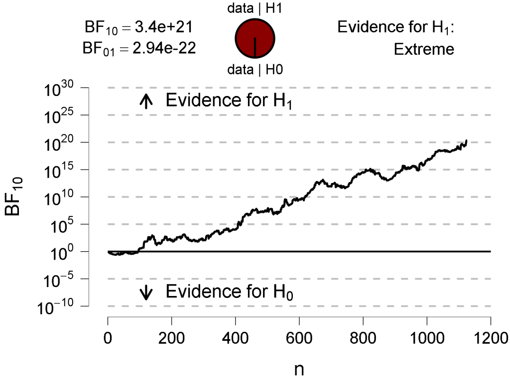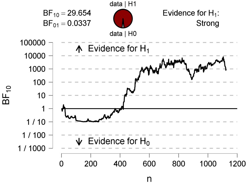 A coeficiente de correlação entre satisfação e as IRPS foi de 0.300 e o fator bayesiano alcançou 3.396e+21. A análise sequencial evidenciou que os resultados se mostraram compatíveis com as hipóteses desde o início da coleta, conforme visto no gráfico abaixo.