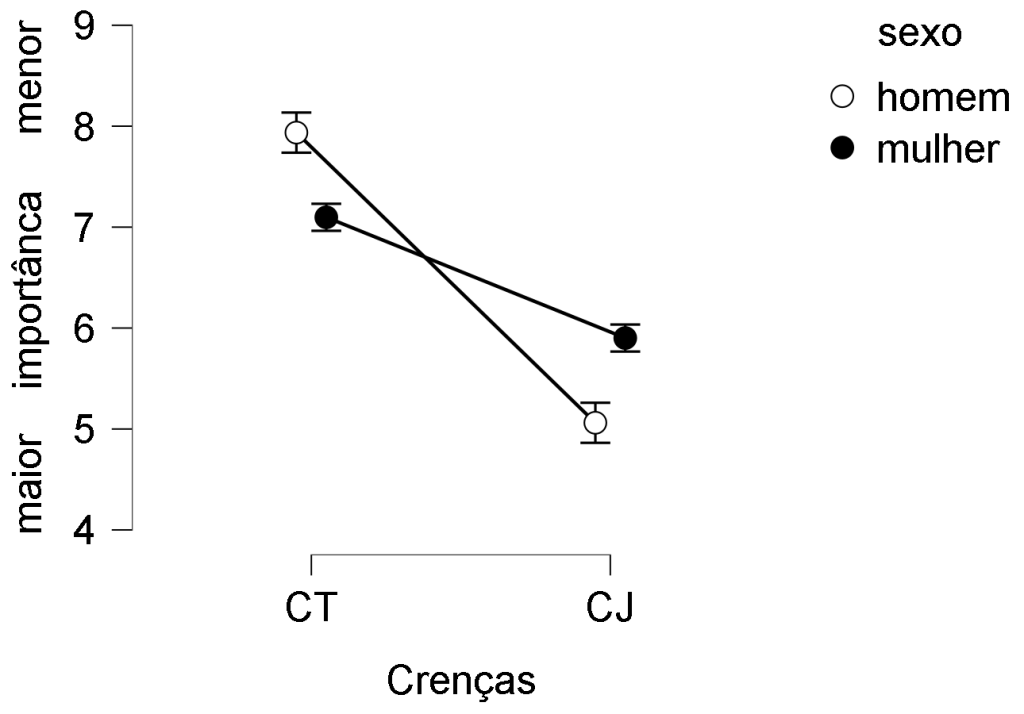 A inspeção visual do gráfico sugere que as CJ tendam a ser mais valorizadas pelos homens, a passo que as CT pelas mulheres, interpretação respaldada pela análise estatística que aponta uma interação entre o sistema de crenças e o sexo do participante( F (1,1234) = 45,934 , p < 0.001). Este resultado aponta que o grau de importância atribuída aos sistemas de crenças tradicionais e cientificamente justificadas depende do sexo do participante, o que confirma as hipóteses 8 e 9.