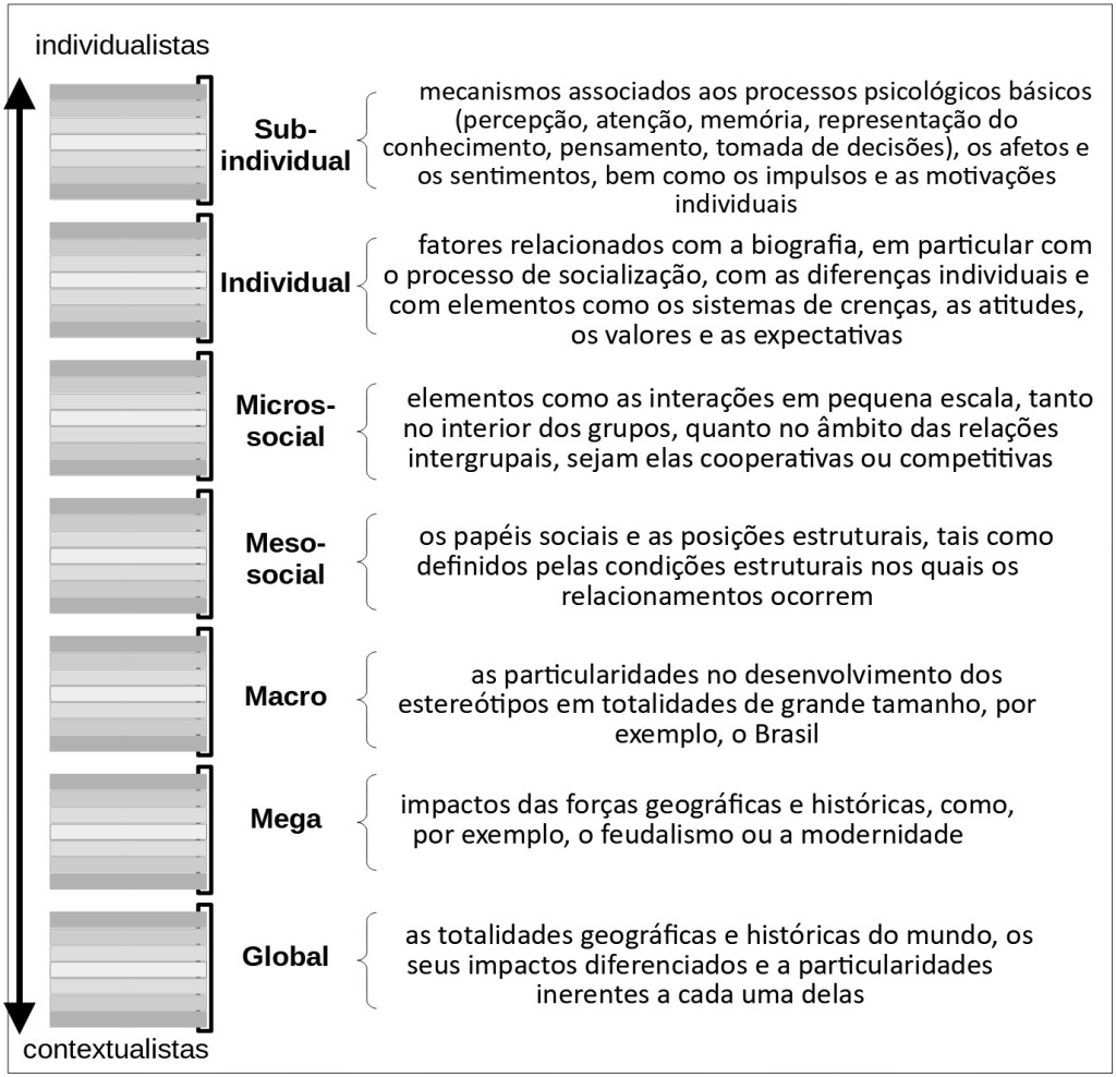 A partir da análise dos manuais acima referidos, bem como de capítulos sobre os estereótipos e preconceitos publicados em obras recentemente publicadas, podemos compor o seguinte cenário a respeito das dimensões de análises a serem consideradas na investigação científica atual dos estereótipos:
