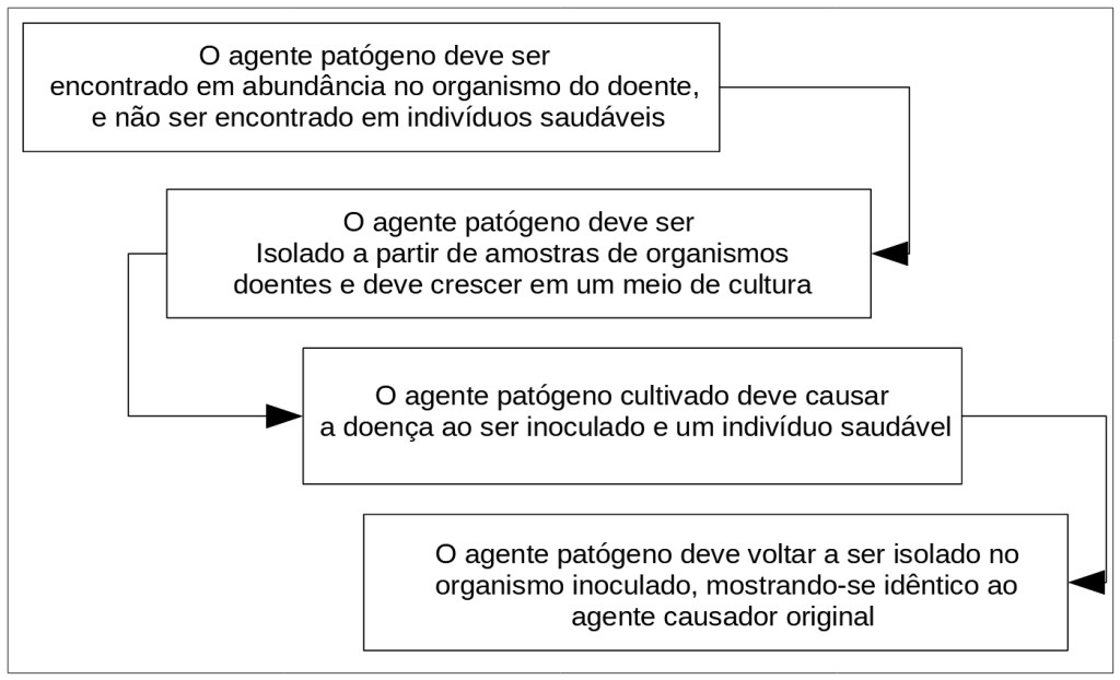 Na figura 80 apresentamos as condições requeridas para a identificação de um agente patógeno e a eclosão da doença decorrente da presença deste agente em um organismo saudável. Uma primeira condição a ser atendida envolve o reconhecimento de que, se um organismo está sob impacto de uma doença, esta resulta dos efeitos de um agente patógeno, por exemplo, um vírus ou uma bactéria. Este deve ser encontrado de forma clara e abundante no organismo doente, ao tempo em que não deve ser detectado em organismos saudáveis. Atendido este primeiro requisito, impõe-se um segundo, marcado pela exigência de obtenção de amostras do agente patógeno nos fluídos corporais do organismo infectado e, mais do que isso, este agente retirado do organismo cultivado em um meio de cultura apropriado deve ser capaz de se multiplicar. O terceiro passo envolve a reintrodução do agente patogênico isolado em organismos saudáveis, os quais, por sua vez, devem evidenciar os efeitos da doença. Um quarto e último passo para a confirmação da origem da doença exige que se isole novamente o agente patógeno no organismo que foi artificialmente inoculado e que o agente seja reconhecido como igual ao inoculado na etapa anterior.