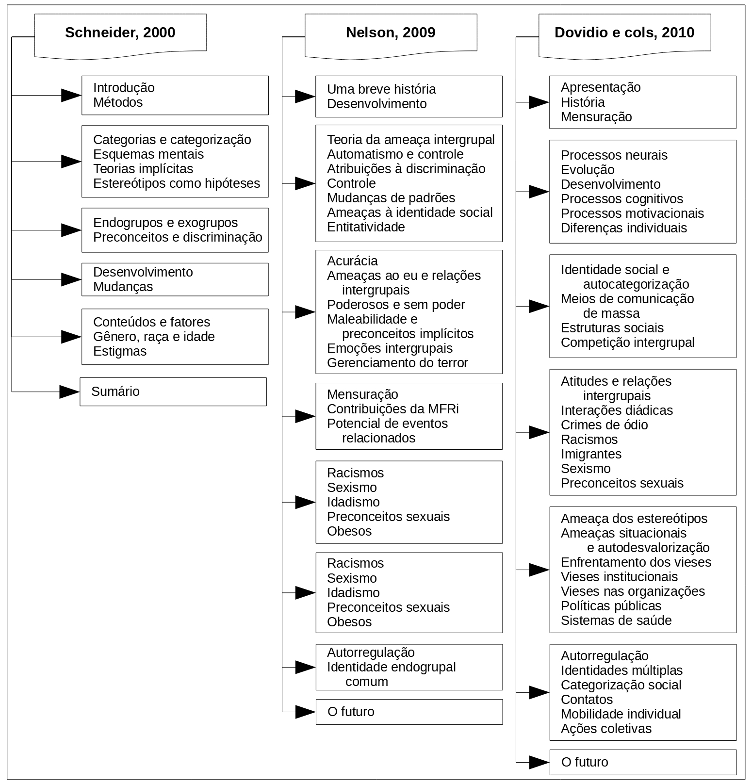O conteúdo dos três principais manuais, representados na figura 78, servirá como fio condutor dos argumentos apresentados na presente seção relativos ao esforço de síntese conduzido pelos pesquisadores da área. O primeiro manual sistemático sobre os estereótipos, denominado simplesmente Psychology of stereotyping, foi publicado em 2003 por David Schneider, professor da Rice University. Amplamente referido e, principalmente, elogiado pelos principais pesquisadores do campo, exerceu um forte impacto na maneira como as obras posteriores passaram a distribuir os capítulos e na determinação das ênfases analíticas adotadas pelos sistematizadores, terminando por se impor como um modelo a partir do qual foram organizados os manuais posteriores.