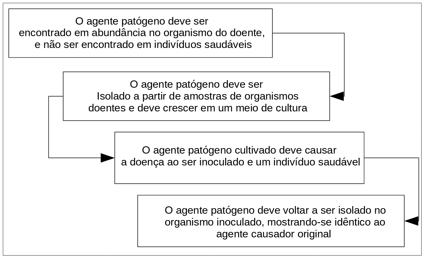 Na figura 80 apresentamos as condições requeridas para a identificação de um agente patógeno e a eclosão da doença decorrente da presença deste agente em um organismo saudável. Uma primeira condição a ser atendida envolve o reconhecimento de que, se um organismo está sob impacto de uma doença, esta resulta dos efeitos de um agente patógeno, por exemplo, um vírus ou uma bactéria. Este deve ser encontrado de forma clara e abundante no organismo doente, ao tempo em que não deve ser detectado em organismos saudáveis. Atendido este primeiro requisito, impõe-se um segundo, marcado pela exigência de obtenção de amostras do agente patógeno nos fluídos corporais do organismo infectado e, mais do que isso, este agente retirado do organismo cultivado em um meio de cultura apropriado deve ser capaz de se multiplicar. O terceiro passo envolve a reintrodução do agente patogênico isolado em organismos saudáveis, os quais, por sua vez, devem evidenciar os efeitos da doença. Um quarto e último passo para a confirmação da origem da doença exige que se isole novamente o agente patógeno no organismo que foi artificialmente inoculado e que o agente seja reconhecido como igual ao inoculado na etapa anterior.