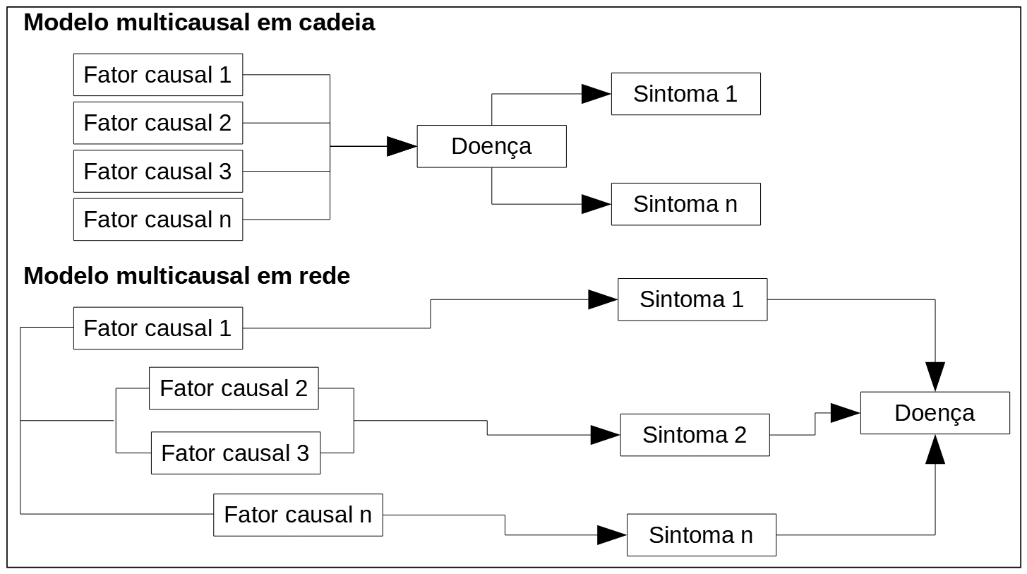 A primeira sistematização das explicações multicausais se assentava no entendimento de que a expressão das doenças de etiologia mais complexa, ou seja, as que passaram a afetar mais a saúde da população a partir do momento em que as doenças infectocontagiosas foram relativamente controladas, dependia de um conjunto de fatores. O modelo multicausal em cadeia representou a primeira versão dessa perspectiva ao definir a necessidade de identificar os fatores que ajudam a explicar a manifestação de uma doença. A explicação da tuberculose, por exemplo, ainda que demandasse a contaminação por um agente biológico claramente identificado (fator casual 1, no modelo), deveria levar em consideração uma reação em cadeia e era dependente de outros fatores, como as condições de habitação do paciente (fator 2), ou os padrões alimentares (fator 3). A elaboração de um modelo explicativo com estas características demandou o desenvolvimento de desenhos de pesquisa mais elaborados, capazes de isolar as variáveis confundidoras e permitir o acompanhamento da evolução da doença em coortes distintas de pacientes oriundos de uma mesma população ou de populações distintas. O papel dos desenhos fatoriais e, em particular, o surgimento e a difusão de testes estatísticos mais sofisticados como a ANOVA, os modelos de regressão linear e logística e a análise loglinear, ofereceram os meios para a formulação destes primeiros modelos multicausais. A elaboração destes modelos explicativos se defrontava com dois grandes desafios metodológicos, sendo o primeiro deles determinar a natureza e a intensidade das relações entre os fatores causais e, o segundo, inferir como estes padrões de associações determinavam os fatores biológicos característicos de cada patologia. As dificuldades encontradas em oferecer solução para estas questões terminaram por evidenciar que as explicações elaboradas com base no modelo de causas encadeadas pareciam ser muito limitadas, face à complexidade analítica exigida para a explicação das doenças.